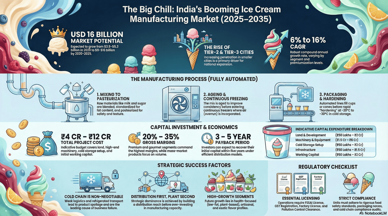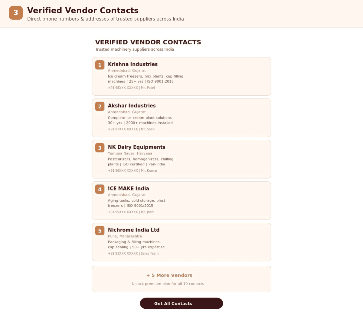 Limited consultancy for setting up an ice cream manufacturing unit—from machinery to business setup—providing key business steps and vendor contacts.