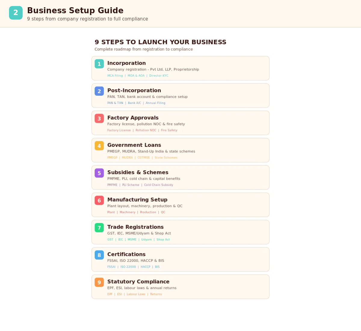 🏢 Incorporation, 📋 Post-Incorporation, 🏭 Factory Approvals, 💰 Government Loans, 🎯 Subsidies & Schemes, ⚙️ Mfg / Business Setup, 🌐 Trade Registrations, ✅ Certifications, 📊 Statutory Compliance